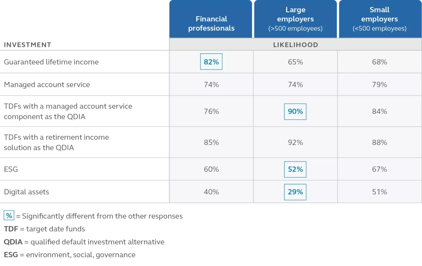 Three in 4 financial professionals and employers feel that a common investment offering by 2030 will include personalization investment portfolios. And this personalization will likely overflow to providing some form of advice to employees. The majority of our respondents (90%) believe advice will come from a financial professional. However, 81% of employers also feel it will also come through a digital advice tool, whereas only 69% financial professionals feel this way.
