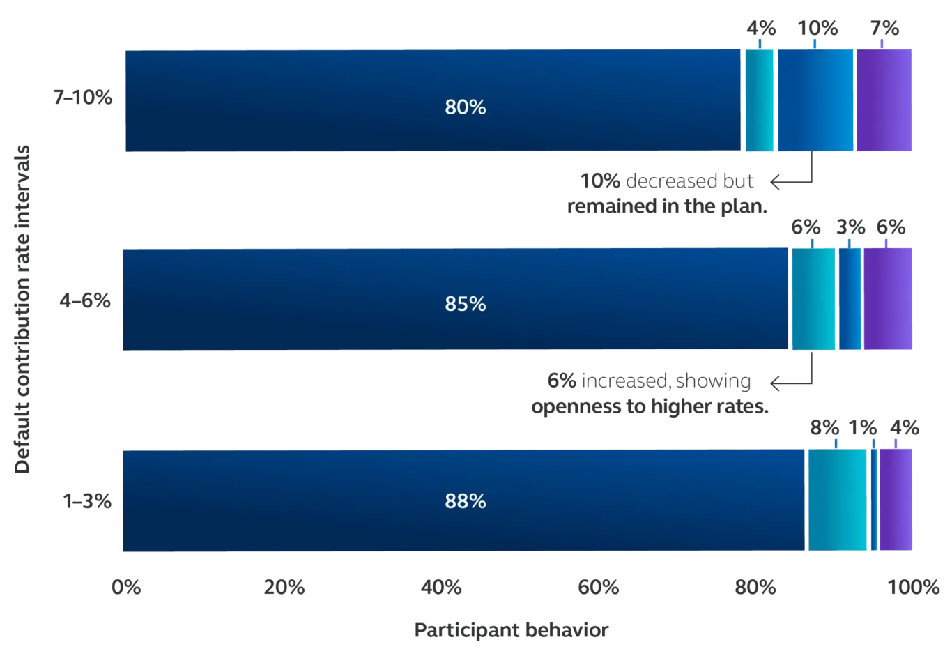 The default contribution rate is extremely important as many participants stay where they start. Low default contribution rates can be particularly problematic for non-desk employees. With potentially less time to save, a 3% default contribution, for example, may not be enough to help them build adequate retirement savings.