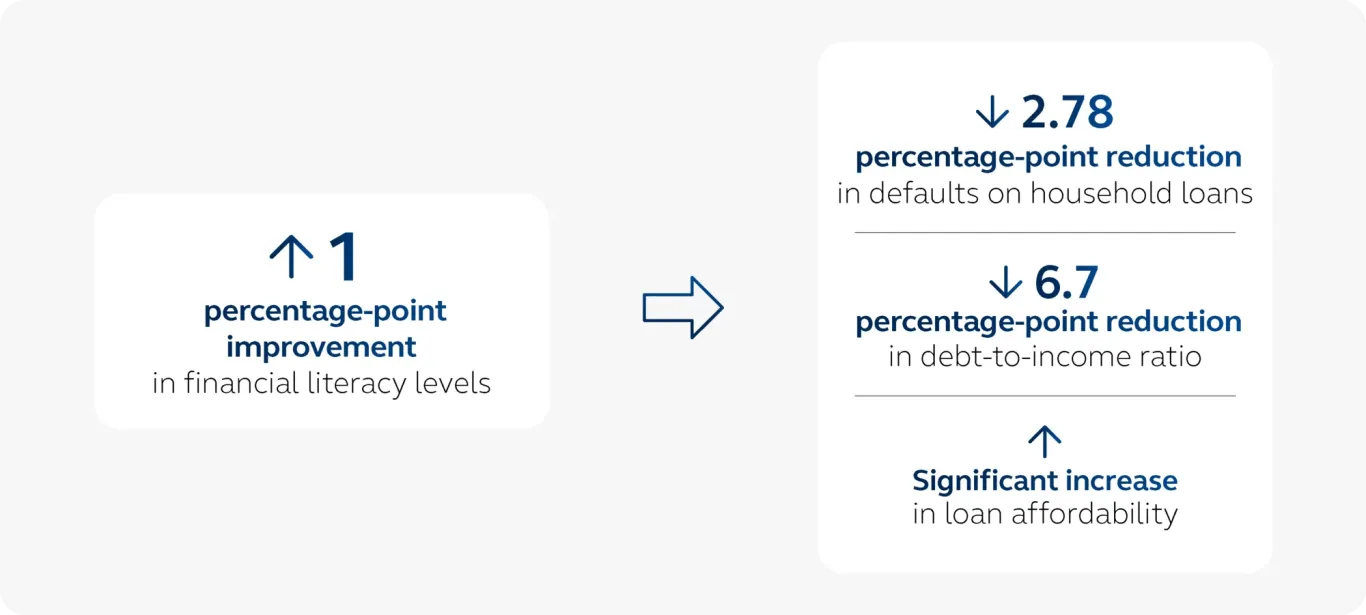 A 1% improvement in financial literacy: Associated with a 2.78% reduction in defaults on household loans. Results in significantly increased loan affordability and is associated with a 6.7% reduction in debt-to-income ratios.